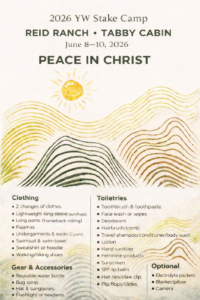 Stake Young Women’s camp @ Reid Ranch. June 8-10, 2026. Registration Deadline May 8th. Theme: Peace in Christ